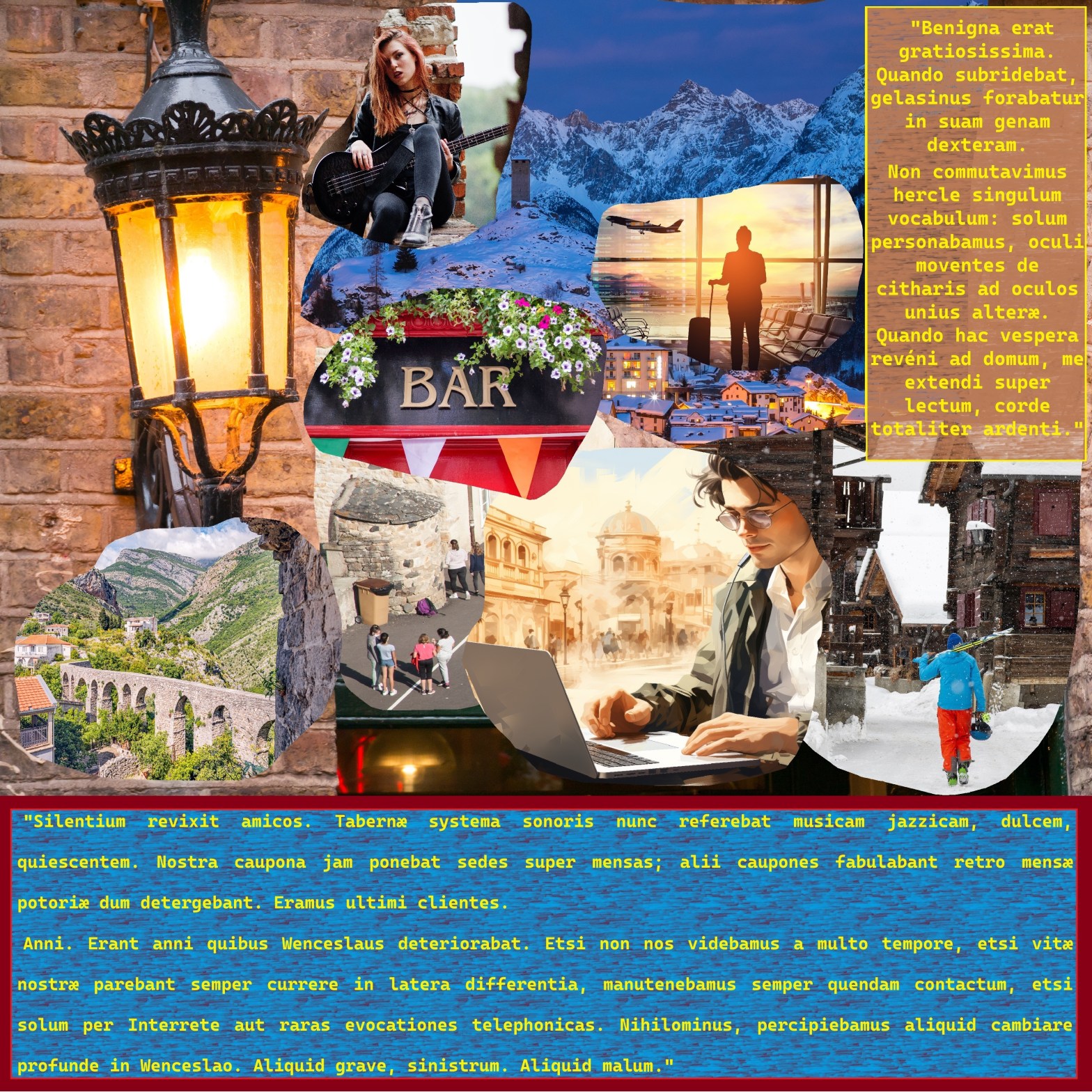 Saturni die, 30 Novembris 2777 A.U.C. scribit: Julianus Callinicus ⸙⸙⸙ Aër erat luteus, systema sonoris referebat carmen rochanrullæ ex annis septuagesimis A.D., de illis in quibus abundant citharæ electricæ et viri qui canunt voce acuta. Clientes tabernæ erant pauci, pacati; erat autem Lunæ dies. Invéni amicos in fundo, sedentes in accubitionem quæ circumdabat mensam. Per… Read more